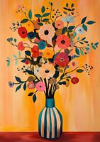 Bloemen Vaas | Vrolijke Bloemen - Op dit bloemen schilderij zie je een kleurrijk boeket met diverse bloemen in een vaas, tegen een levendige gele achtergrond, wat een vrolijke tuin sfeer oproept.