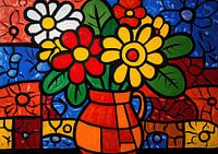 Bloemen Vaas - Op dit bloemen schilderij zie je een vaas met kleurrijke bloemen zoals gele, rode en witte bloemen, met een levendige achtergrond van verschillende kleuren die een vrolijke sfeer uitstralen.