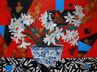 Details: bloemen schilderij, witte bloemen, bloemen vaas, modern schilderij, rode achtergrond, geometrische vormen, zwart, goud, kunst, interieur