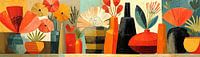 Bloemen Vazen | Abstract Bloemen Stilleven - Op dit bloemen schilderij zie je een kleurrijke verzameling van verschillende vazen en bloemen, met opvallende vormen en felle kleuren zoals rood, geel en blauw die een moderne en vrolijke uitstraling geven.