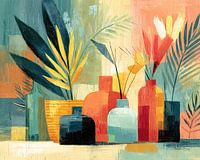 Bloemen Vazen | Kleurrijke Vazen - Op dit stilleven schilderij zie je een kleurrijke compositie van vazen en bloemen, met opvallende groene en gele bladeren die een vrolijke sfeer uitstralen.