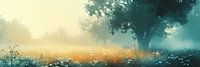 Bloemen Veld - Dit is een landschap schilderij met een mistige achtergrond waarin een glooiend veld te zien is, bezaaid met bloemen en omgeven door grote bomen.