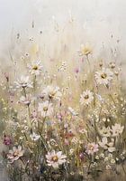 Bloemen Veld - Op dit bloemen schilderij zie je een veld vol delicate witte en roze bloemen, die vrolijk te midden van groene stelen en zachte achtergrondkleuren staan, wat een frisse en rustige sfeer creëert voor in de tuin.