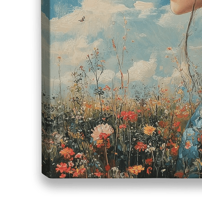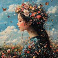 Bloemen Vrouw - Dit vrouwen schilderij toont een jonge vrouw met een rijk versierde bloemenkrans op haar hoofd, omgeven door een kleurrijk bloemenveld en fladderende vlinders tegen een blauwe lucht.