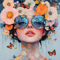 Bloemen Vrouw - Op dit vrouwen schilderij zie je een jonge vrouw met grote, reflecterende zonnebrillen omringd door kleurrijke bloemen en vlinders, waarbij de warme tinten bloemen weerspiegeld worden in haar bril.