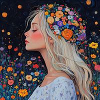 Bloemen Vrouw - Dit bloemen schilderij toont een vrouw met lang blond haar en een weelderige kleurrijke bloemenkrans op haar hoofd, geschilderd tegen een donkere nachtelijke achtergrond met flonkerende sterren.