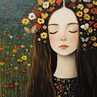 Bloemen Vrouw - In dit bloemen schilderij zie je een vrouw met lang, bruin haar versierd met een kleurrijke bloemenkrans, gesloten ogen, omringd door een veld van wilde vrolijke bloemen, waaronder twee witte vlinders zich bevinden.