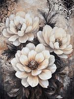 Bloemen | Witte Bloemen - Dit is een bloemen schilderij met drie grote, witte bloemen op een verweerde, zwarte achtergrond met subtiele gouden accenten.