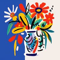 Abstracte afbeelding van bloemen in een vaas. Het doek is opgedeeld in een kobaltblauw en wit gedeelte. De bloemen contrasterende prachtig door het primaire kleurgebruik. Simplistische vormgeving met prachtige diepe kleuren en donkere lijn accenten. Modern. Passend bij diverse stijlen en trends. Pop of colour.