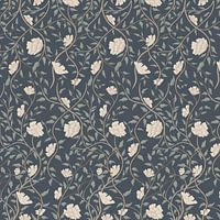 Het schilderij laat diverse bloemen zien die elkaar afwisselen tussen de bladeren en takken. De beige pastel bloemen wisselen elkaar af op de blauwe achtergrond. Het patroon is met de hand getekend. Bloem voor bloem, blaadje voor blaadje.