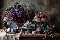 Dit bloemen en gebak stilleven in diepe tinten van paars, lavendel, teal en zachtblauw voelt mysterieus en elegant aan en brengt warme verfijning in je interieur. De compositie met macarons, cupcakes en druiventrossen ademt een sfeer van luxe en poëtische stilte. Mooi passend in Romantische, Klassieke, Grandeur Chique en Modern Chic…