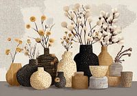 Details: bloemen, vazen, stilleven, aardetinten, crèmewit, zwart, goud, natuurlijk, modern, decoratie