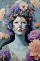 Vrouwen gezicht met diverse bloemen zoals, rozen en Gerbera en vlinders.