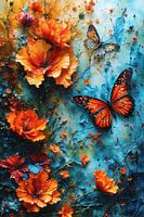 De afbeelding toont feloranje klaprozen en twee vlinders tegen een diepblauwe achtergrond met structuur. De gedetailleerde weergave van de bloemblaadjes en de delicate vlinders creëren een harmonieus totaalbeeld vol levendigheid en lichtheid. Het contrast tussen de warme oranje tinten en het koele blauw versterkt het effect.