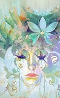Een vrouwengezicht met diverse bloemen in verschillende kleuren. Lichte pastelkleuren.