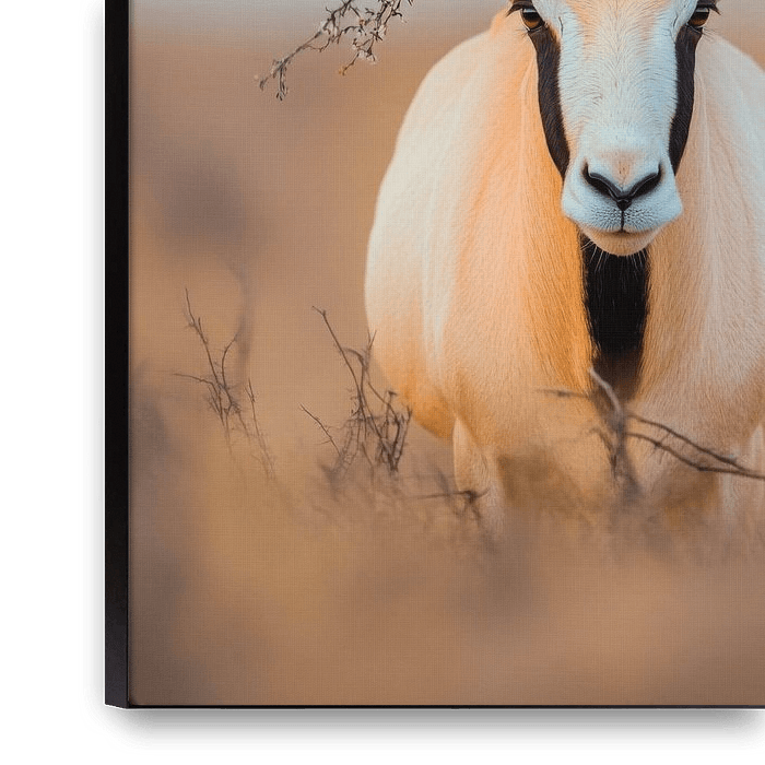 Een majestueus wezen troont in het lieflijke landschap, gekroond met kleurrijke bloemen die het een feestelijke gloed geven. De lange, gebogen hoorns en elegante witte vacht harmoniëren perfect met de levendige kroon, die bijna koninklijk aandoet. Een fascinerend voorbeeld van de schoonheid van de natuur die de grenzen tussen wildernis…