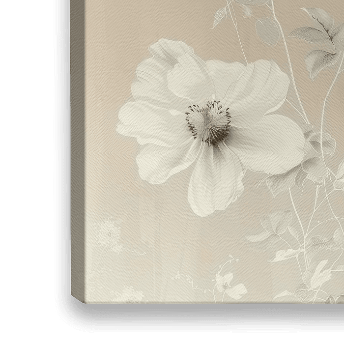 Bloemen in Japandi stijl, in de stijl nieuw landelijk. Witte bloemen op een taupe kleurige achtergrond. Kies zelf het formaat en materiaal bij dit werk en maak er een echte blikvanger van voor jouw interieur.