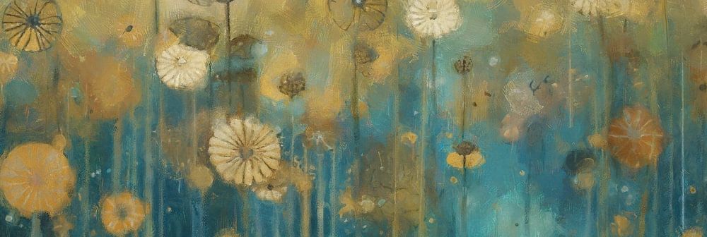 Dit werk toont een veld van delicate bloemen tegen een achtergrond die verloopt van diepblauw naar goudgeel. De bloemen, in diverse vormen en tinten, lijken als zwevend in een nevelige atmosfeer. De subtiele overgang van kleuren geeft het geheel een dromerig effect en creëert een gevoel van mysterie en sereniteit. De verticale strepen die uit de bloemen lijken te vloeien versterken dit effect en voegen een dynamisch element toe. Dit werk is perfect voor ruimtes waar men een kalmerende en rustgevende sfeer wil creëren, zoals een slaapkamer of studeerkamer.