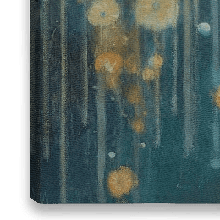Dit werk toont een veld van delicate bloemen tegen een achtergrond die verloopt van diepblauw naar goudgeel. De bloemen, in diverse vormen en tinten, lijken als zwevend in een nevelige atmosfeer. De subtiele overgang van kleuren geeft het geheel een dromerig effect en creëert een gevoel van mysterie en sereniteit. De verticale strepen…