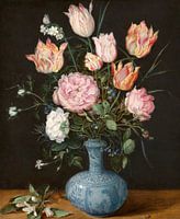 Dit kleine boeket van voornamelijk rozen en tulpen staat in een speciale Chinese porseleinen vaas: een kendi, of Chinese waterfles. Brueghel plaatste het voor een donkere achtergrond, waartegen de rozen, narcissen en gevlamde tulpen goed afsteken.