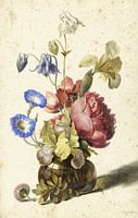 Dirck de Bray was een alleskunner: hij maakte etsen, houtsneden en beeldhouwwerk, maar werd beroemd als schilder van bloemstillevens. Anders dan zijn tijdgenoten stelde hij boeketten samen van bloemen die in hetzelfde jaargetijde bloeien. Hier zijn dat onder meer witte en blauwe akelei, gele lis, pioenroos, iris en winde. Dat nog niet alle bloemen in het boeket zijn gestoken, is ook typerend voor De Bray.