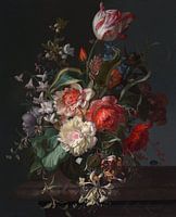 Een prachtige tulp bekroont de top van dit kleurrijke bouwwerk. Het diepe clair-obscur herinnert aan Ruysch' vroegere producties, maar het belangrijkste verschil tussen dit schilderij en de Bloemen in een vaas ligt in het gevoel van overdaad dat typerend is voor de latere werken van de kunstenaar. In 1708 werd haar uitzonderlijke talent beloond met een prestigieuze benoeming tot hofschilder van de keurvorst Palatijn in Düsseldorf.