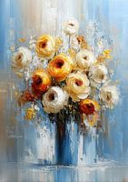 Een abstract olieverfschilderij toont bloemen in een vaas tegen een lichtblauwe achtergrond. Witte en gele rozen en oranje pioenrozen zijn weergegeven in een impressionistische techniek met zichtbare, grove penseelstreken. De textuur van het doek en de royale toepassing van verf creëren een expressief effect, terwijl onregelmatige randen en kleurspatten dynamiek aan het werk toevoegen. De compositie combineert vintage charme met emotionele expressie en creëert een levendige, artistieke sfeer. Ideaal voor liefhebbers van abstracte olieverfschilderijen, impressionistische bloemmotieven en decoratieve wandkunst die op zoek zijn naar energie, kleur en vintage esthetiek in een kunstwerk.