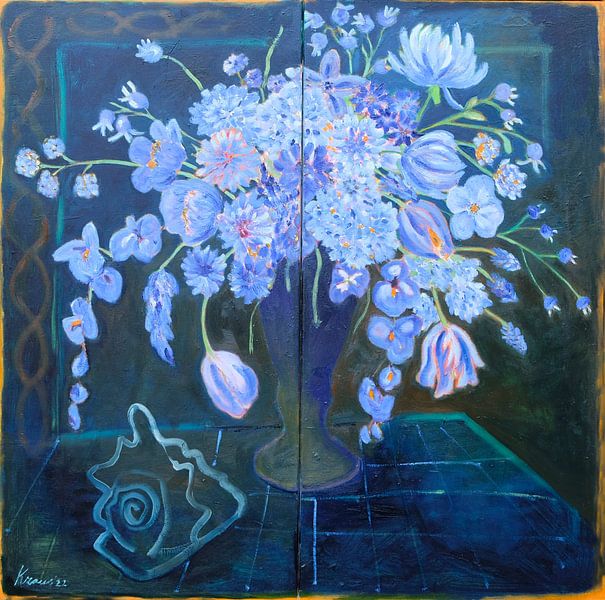 In de 17 eeuw was het schilderen van grote bloemstukken heel populair hoe uitbundiger hoe beter. De boeketten werden soms geschilderd alsof ze in een nisje stonden met daarom heen schelpen en vliegjes. ook dit werk is daarop gebaseerd