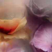 Experiment met bloemen in ijs. Door de bloemen eerst te bevriezen en vervolgens in een smeltend ijsblok te fotograferen, is er een bijzonder abstract effect ontstaan. Bijzonder kleurenpalet in paars en oranje.