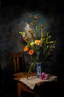 Mijn inspiratie zijn de oude meesters, rembrandtstijl, Vermeer stijl. Deze foto heeft diepte en mooie kleuren bloemen. De vaas is ook uit de tijd van de oude meesters. De foto heeft diepte en daardoor een echt gevoel dat je er bent. Het heeft diepte en gezelligheid. Deze foto staat mooi in een keuken, of een kamer. Maar ook in een sjiek restaurant of een museum door het gevoel dat de foto afgeeft.