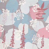 Botanische illustratie met bloemen in pastelkleuren. Semi abstracte bloemen en bladeren. Trendy pastelkleuren.