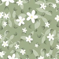 Dit mooie boeket bloemen bestaat uit witte bloemen en verschillend bladgroen. De licht pastel groene en donker groene bladeren wisselen elkaar af op een groene achtergrond. In het schilderij hebben de bloemen gele knopjes, voor een mooi contrast.
