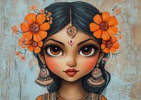 Bloemen meisje - Op dit vrouwen schilderij zie je een meisje met grote, sprankelende ogen en opvallende oranje bloemen in haar haar, wat een vrolijke uitstraling geeft aan het portret.