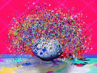 Vaas met mooie bloemen voor een roze achtergrond. Vrolijk, kleurrijk, modern schilderij