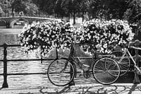 Prachtige opname in zwart-wit (ook verkrijgbaar in kleur) van zomerse bloemen op een brug over de grachten van Amsterdam. De fiets erbij maakt het Hollandse plaatje compleet