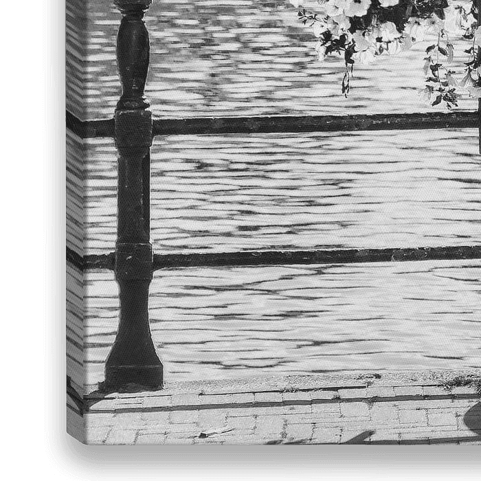 Prachtige opname in zwart-wit (ook verkrijgbaar in kleur) van zomerse bloemen op een brug over de grachten van Amsterdam. De fiets erbij maakt het Hollandse plaatje compleet