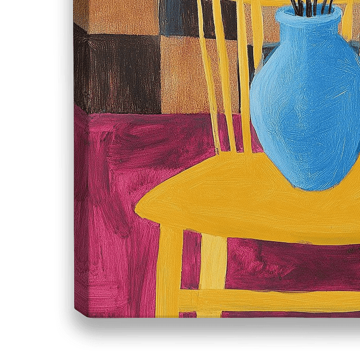 Acrylschilderij met roze bloemen in een blauwe vaas op een gele houten stoel, met een zwart-beige geblokte achtergrond, in een eenvoudige, minimalistische stijl, in de stijl van Henri Matisse.