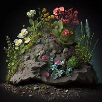 "Floral Emergence" toont een levendige verzameling verschillende bloemen en planten die ontspruiten uit een ruige rots. Felgele, roze, blauwe en rode bloemen contrasteren prachtig met weelderig groen en een donkere achtergrond die de vitaliteit en veerkracht van de natuur benadrukt. Deze opvallende compositie straalt een gevoel van…