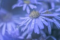 Close up van een paarse Aster alpinus, ofwel alpenaster, waar gebruik is gemaakt van meervoudige belichting, waar één foto wazig is en één scherp, wat voor een zacht effect zorgt.