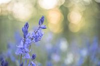 Close up van een blauwe boshyacinth met een warme, zonnige en zachte bokeh achtergrond.