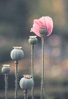 Portret van uitgebloeide klaprozen, waar nog welgeteld één bloemblaadje aan zit.