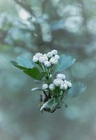 Close up portret van een tak met witte bloesem, met een zachte grijs groene achtergrond. De foto is gemaakt in het arboretum Belmonte in Wageningen.