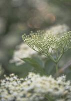 Closeup van de ontluikende bloem van de gewone vlier. Op de doffe voor- en achtergrond zie je de bloeiende bloemen.