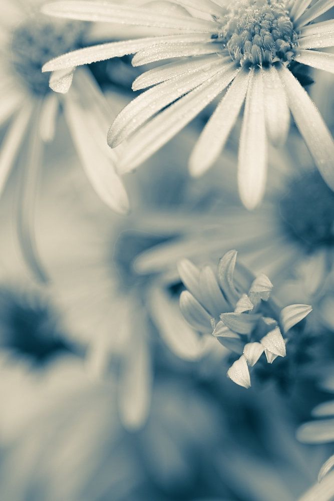 Close up van een astersoort die bloeit in het najaar. De foto is bewerkt in zwart-wit met blauwe tinten.
