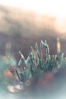 Close up van ontluikende sneeuwklokjes, in het gouden licht van de opkomende zon. De foto is bewerkt in zachte pasteltinten.