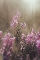Close up van bloeiende dopheide. De opkomende zon zorgt voor mooi warm licht op de achtergrond. De foto is in een retro stijl bewerkt.