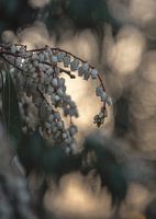 Close up van een bloeiende pieris, met het gouden licht van de opkomende zon op de achtergrond.