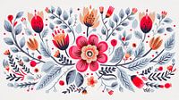Een eenvoudig folkloristisch bloemen en planten patroon geïnspireerd door de Scandinavische volkskunst.De kunst print heeft een panorama formaat. Het kleuren grijs, rood en oranje tinten tegen een witte achtergrond.