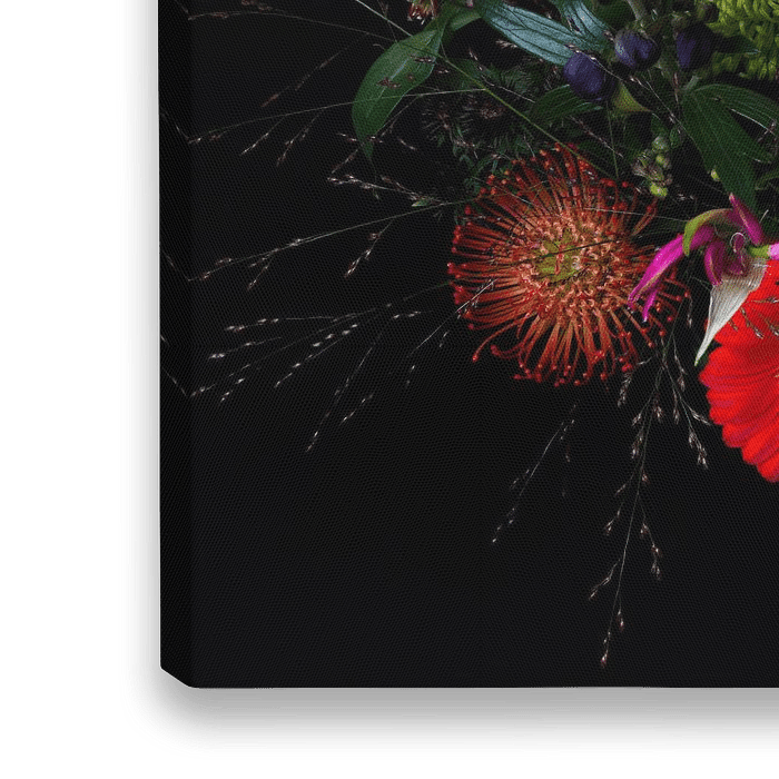 Boeket kleurrijke bloemen op een zwarte achtergrond met sprankelende kleuren. De afbeelding heeft een vierkante vorm.