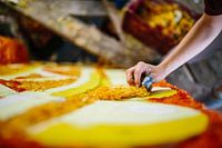 De bloemen worden allemaal met de hand op de corsowagens geprikt.
